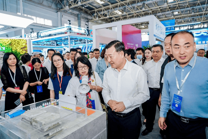 姜萬榮副部長參觀澎內傳展臺,邊聽講解、邊認真觀看水池池壁裂縫自愈合實際應用效果。