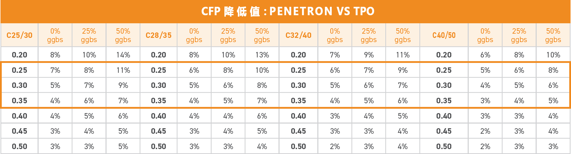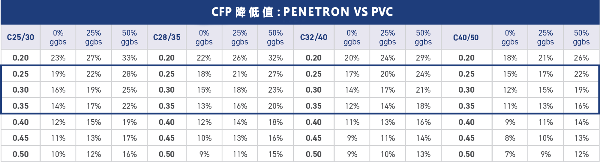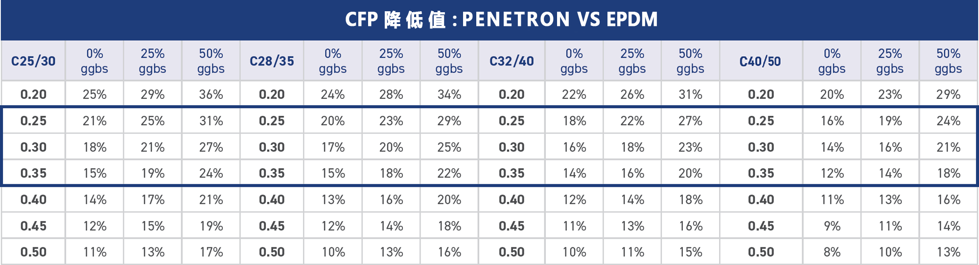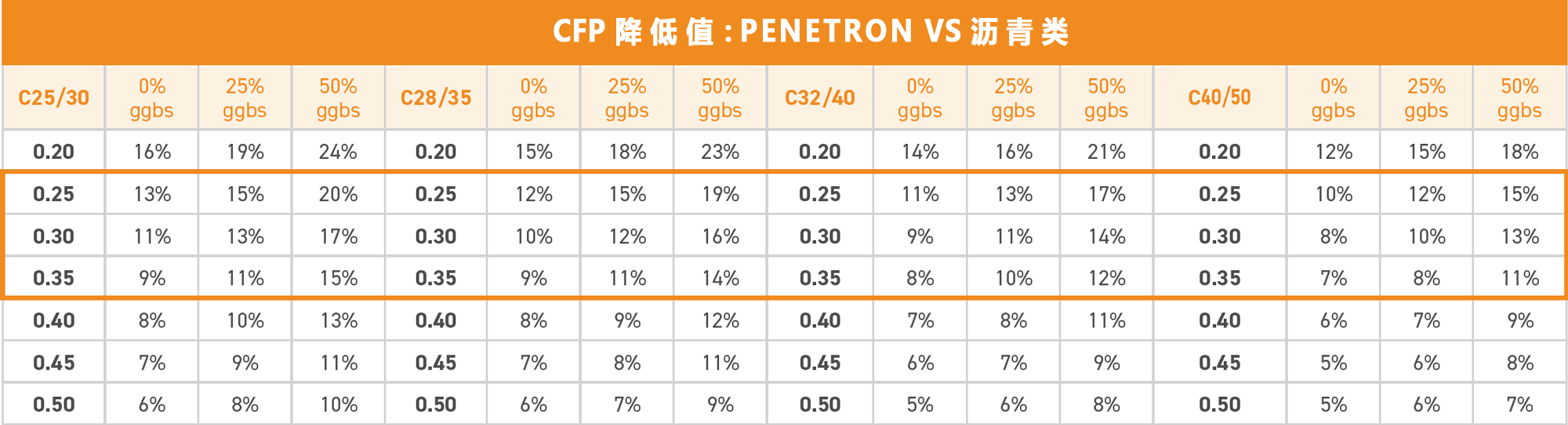 按照結構平均厚度0.25-0.35m計算每平方米混凝土的CFP,將PENETRON ADMIX 澎內傳混凝土防水添加劑(PNC803)與上述表面處理方案進行比較?,結果見右表。